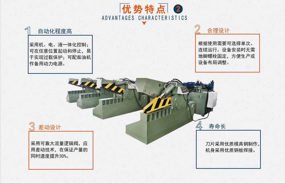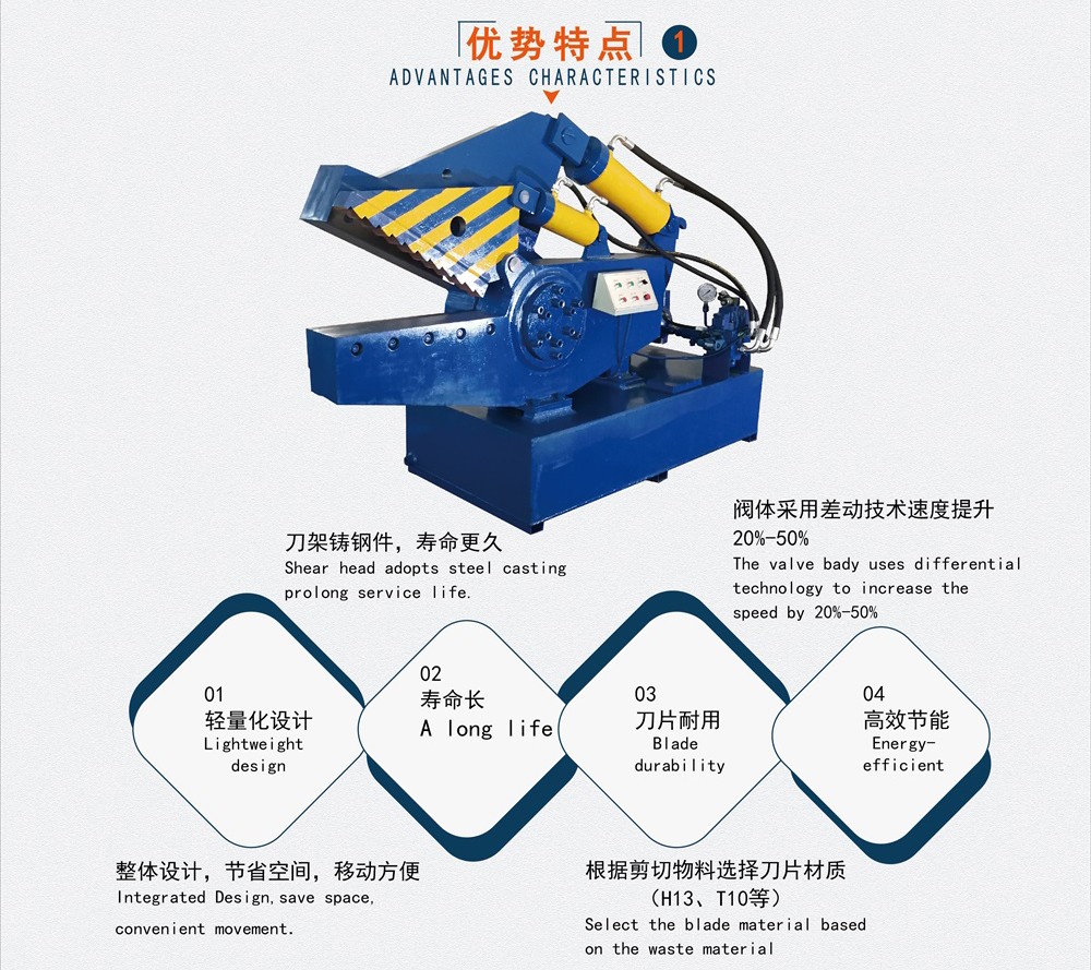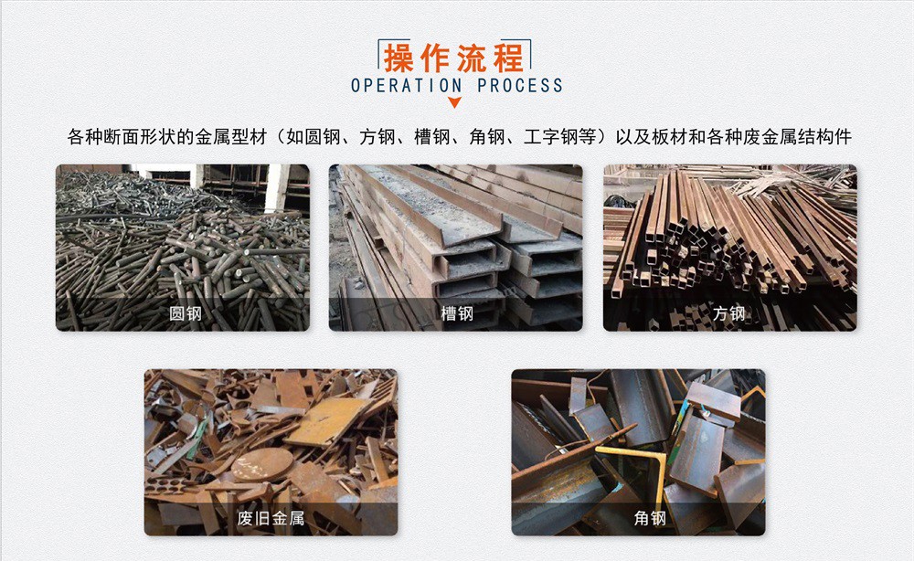 產品描述:適用物料:圓鋼、方鋼、槽鋼、角鋼、工字鋼、鋼板、鋼管、自行車、鋼筋、車架等。 應用范圍:用于各種斷面形狀的金屬型材以及板材和各種廢金屬結構件的冷態剪切,使之成為符合要求的爐料,并便于儲存和運輸。可以為金屬回收業、 鑄造冶煉業、機械建筑業等眾多行業配套服務。。 剪切優勢:廢料通過剪切后成為符合要求的爐料,并便于儲存和運輸。 設備選型:本設備型號有40噸、63噸、100噸、125噸、160噸、200噸、250噸、315噸、400噸、500噸、630噸;設備分為一體式、分體式;輔助設備可選輸送機等,支持各種定制。